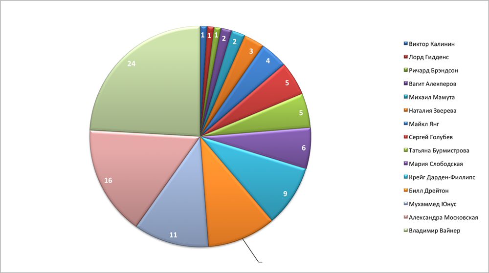 Одна из лидирующих позиций в списке - "Владимир Вайнер" - во многом связана с тем, что респонденты - в момент опроса отвечали как слушатели курса, автором и ведущим которого Владимир является, поэтому при другом аналогичном опросе (в другое время и в той же аудитории) позиция этого эксперта, вероятно, будет другой.