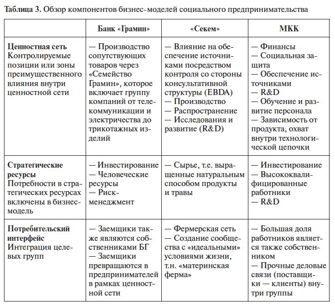Во-первых все они производят социальное благо. Для банка Грамин – это устранение бедности сельских женщин Бангладеш, для Секема – выращивание натуральных продуктов без химических удобрений, а также поощрение культурной и общественной жизни в Египте, для кооператива Мондрагон – создание рабочих мест и возможностей экономического развития для людей, которые раньше их не имели. Во-вторых, своим успехом эти организации обязаны особому сочетанию социальной и экономической эффективности. В третьих, деятельность всех трех компаний основана на разделении общих ценностей «общины», которые использовались для 1. Создания поддерживающей социальной сети (ценностной сети), 2. Приобретения стратегических ресурсов, 3. Управления взаимодействием с потребителями (потребительским интерфейсом).