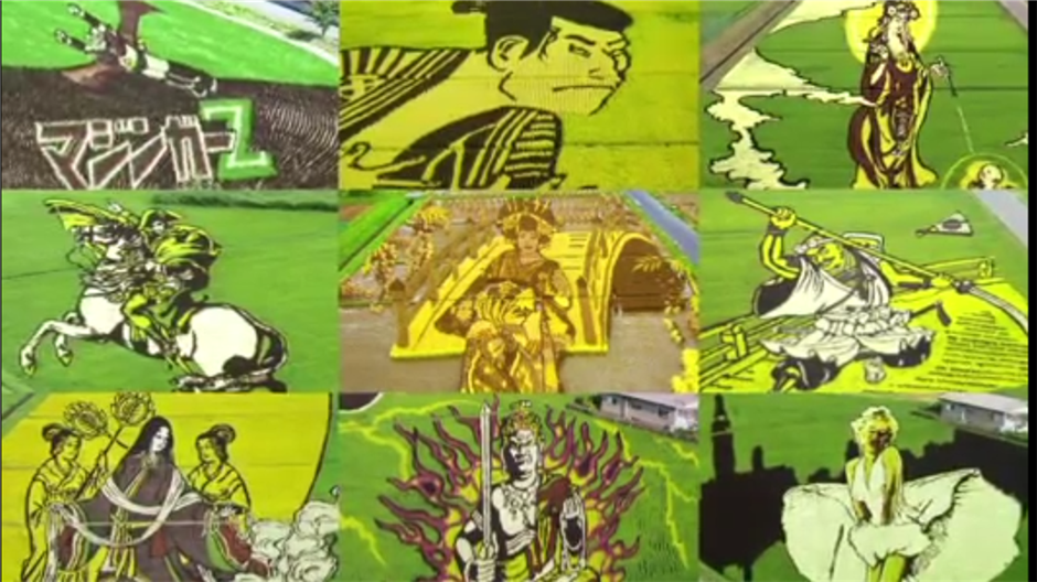 "Рисовый код" - проект, запущенный в Японии, для повышения популярности идеи потребления риса, национального продукта. На рисовых полях за счет высаживания в определенных комбинациях разных сортов риса, отличающихся по цвету, получаются известные японские картины и образы, а также картины, известные во всем мире. На такие "рисовые картины" съезжаются посмотреть и жители Японии, и туристы, тут же можно приобрести любой вид риса, заказать доставку домой и пр. Разработано специальное приложение, через которое можно следить за "ростом и созреванием" картин и также совершать покупки риса.