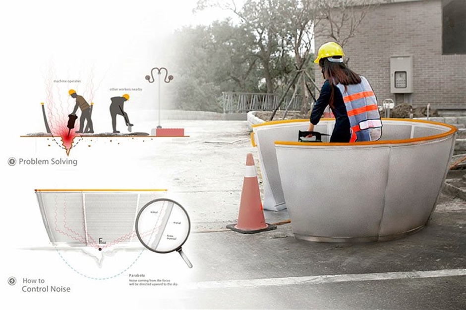Дизайнер Ши Дянь Чан и Син Сиэнг Лин придумали мобильное заграждение для дорожных рабочих, позволяющее уменьшать шум от работы отбойного молотка, переправляя звуковые волны наверх.