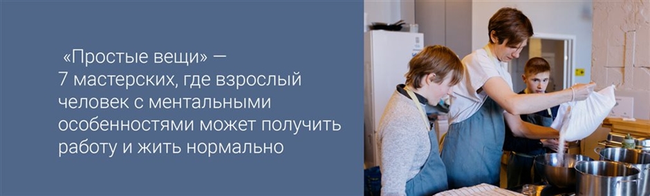 Инклюзивные мастерские «Простые вещи» – это открытое пространство в Санкт-Петербурге, где взрослые люди с особенностями развития психики и интеллекта работают и занимаются творчеством на равных с мастерами и волонтерами в 6 мастерских: графической, швейной, керамической, кулинарной, столярной и арт-студии.