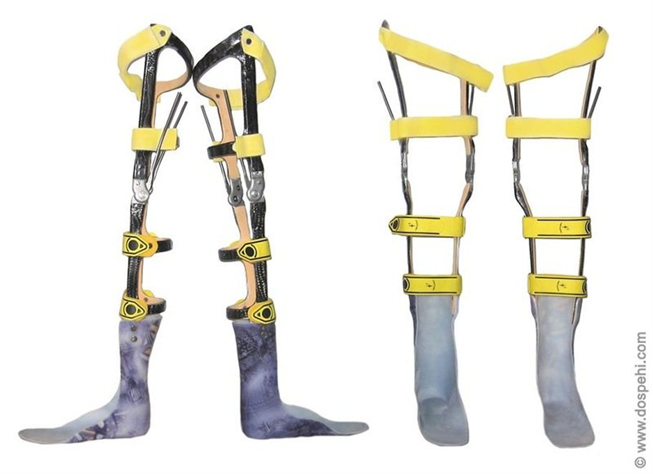 Конструкция включает в себя ортезы (фиксаторы суставов ног) с пружинно-шарнирным механизмом, и жесткий корсет. Для опоры при передвижении используются ходунки.